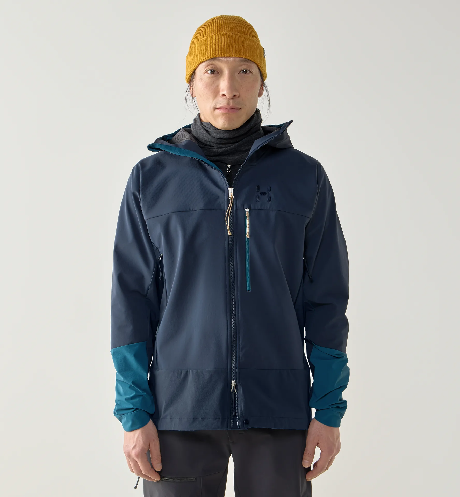 This is a hard-wearing and weather-repellent softshell jacket equipped for mountaineering year-round. It has essential mountainside features like a soft fleece backer, a helmet-compatible hood, raglan sleeves, and harness-compatible pockets.